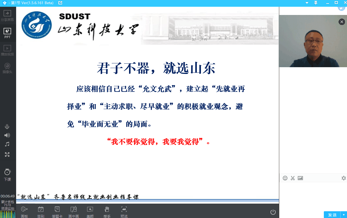 在课堂上,王衍国老师首先从《论语·为政》篇——子曰:“君子不器”作为引入,鼓励全省高校毕业生建立起“先就业再择业”和“主动求职、尽早就业”的积极就业观念,避免“毕业而无业”的局面。随后,王衍国老师具体从就业落实和角色转变等两个方面展开。在就业落实中主要介绍了协议就业和劳动合同就业等两个问题;在角色转变中则分别从老员工与职业人的区别、角色转变的准备过程、角色转变的内容、转换中可能出现的问题和应对策略等5个方面进行了详细讲解。课堂最后,王衍国老师以《论语·子罕》篇——子曰:“吾不试,故艺!”作为结尾,鼓励全省广大2020届毕业生,能够以“君子不器”的真学问、“吾不试,故艺”的精气神,克服新冠肺炎对就业工作带来的不利影响,化危为机,尽快落实就业岗位。