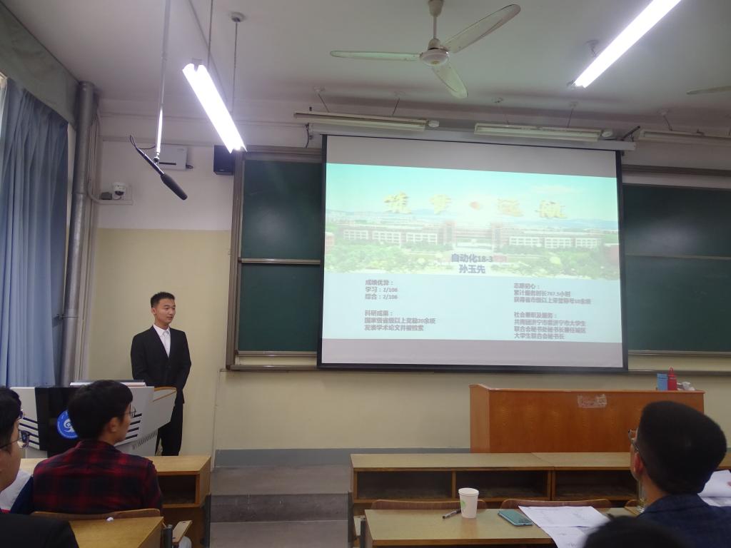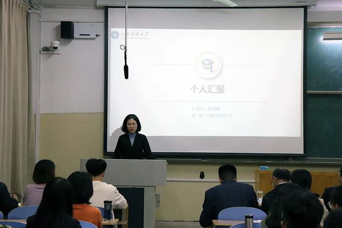 答辩在东校园5103和西校园2104分别依次进行,参会的13名老师及6名员工代表担任答辩评委。23名答辩人按照会前抽签顺序依次上台,采用PPT和现场演说相结合的形式,就思想状况、学习情况、工作情况、科技创新、志愿服务、社会实践、所获奖励等方面的表现进行了汇报展示,答辩评委结合候选人的展示内容进行了现场提问。整个答辩现场庄重而热烈,候选人精神饱满、自信大方,现场观摩员工认真倾听,不时为答辩人的精彩表现报以热烈掌声。
