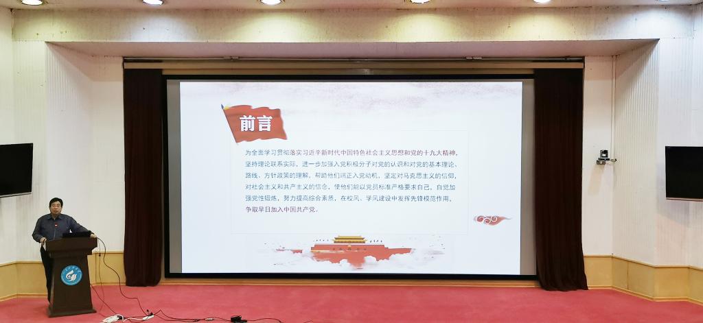 裴国栋从1921年7月浙江嘉兴的红船会议娓娓道起,讲述了中国共产党的光辉历程和党的根本性质与宗旨。随后,裴国栋指出,作为一名入党积极分子,应当在享有党的权利的同时积极履行党的义务,刻苦学习、认真工作、严格自律、善于反思、精诚团结、不惧牺牲,无论何时何地都要发挥模范作用,敢为人先、勇做标兵,贯彻执行党的基本路线和各项方针。中国共产党站在新时代的浪潮之中,必须为中华民族的伟大复兴付出更为艰巨、更为艰苦的努力,对此,最后,裴国栋勉励同学们:一、端正入党动机,只有端正了入党动机,才能坚定入党决心,才能通过党的考察,才能坚定党的信念,才能为党奉献热血,才能经住考验和诱惑。二、坚定共产主义远大理想,把握大势,脚踏实地,敢于担当,要坚持不懈地为实现共产主义而奋斗。三、加强政治理论学习,入党是一件神圣的政治行为,是每个人参与政治的一个重要的有机组成部分,同学们要积极学习党的理论知识,争取早日入党。四、从身边点滴做起,努力学习文化知识,提升研究能力,积极参与各项活动,践行为人民服务的宗旨,坚持模范带头,提升自我、影响他人。