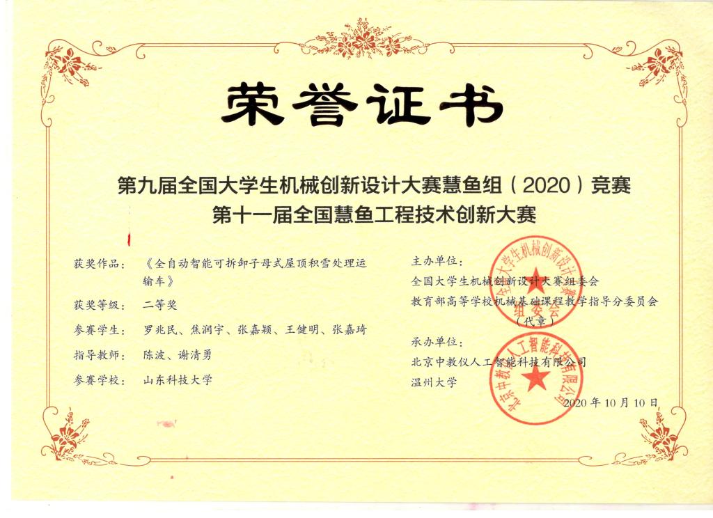 近日,第九届全国老员工机械创新设计大赛慧鱼组竞赛落下帷幕。全球最大顶级体育平台积极组队参加比赛,并取得优异成绩。其中“全自动智能可拆卸子母式屋顶积雪处理运输车”(参赛员工:罗兆民、焦润宇、张嘉颖、王健明、张嘉琦 ,指导老师:陈波、谢清勇)获得国家二等奖,“‘分类精灵’字母式物联网智能垃圾箱”(参赛员工:王帅、焦润宇、罗兆民、王健明、步宇,指导老师:陈波、李保银)、“智能伸缩式阶梯型助老爬楼椅”(参赛员工:王健明、罗兆民、王安航、袁忠阳、王庆杰, 指导老师:陈波、刘秀杰)两个项目获得国家三等奖。