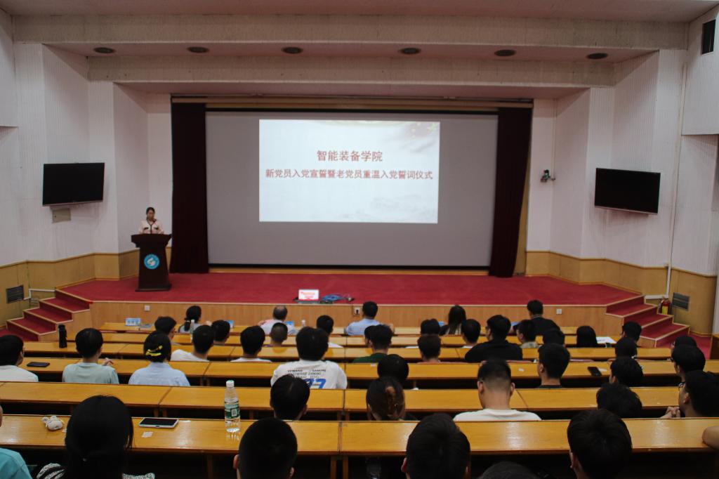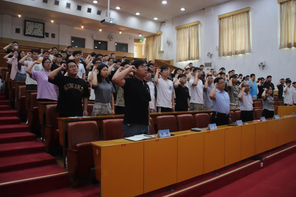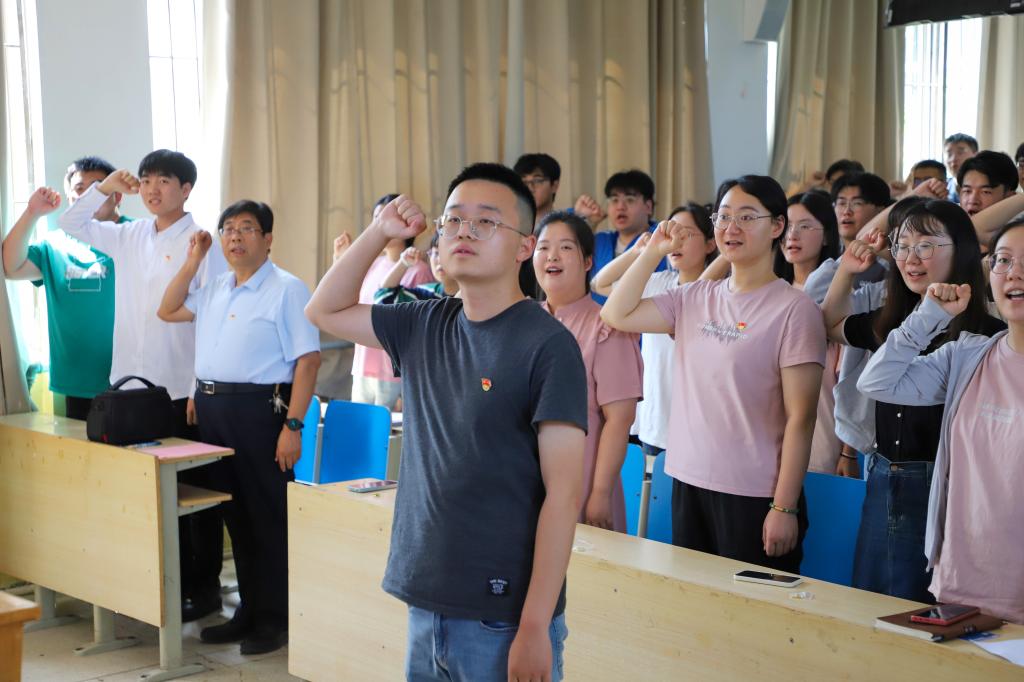 大会在庄严嘹亮的《国际歌》中开幕,谢清勇和辅导员韩晓旭分别宣读参加宣誓的新党员名单。员工第二党支部书记何颖、辅导员孙斌分别作为领誓人带领党员进行入党宣誓。面对鲜红的党旗,全体党员们佩戴党员徽章,高举右手,庄严宣誓。