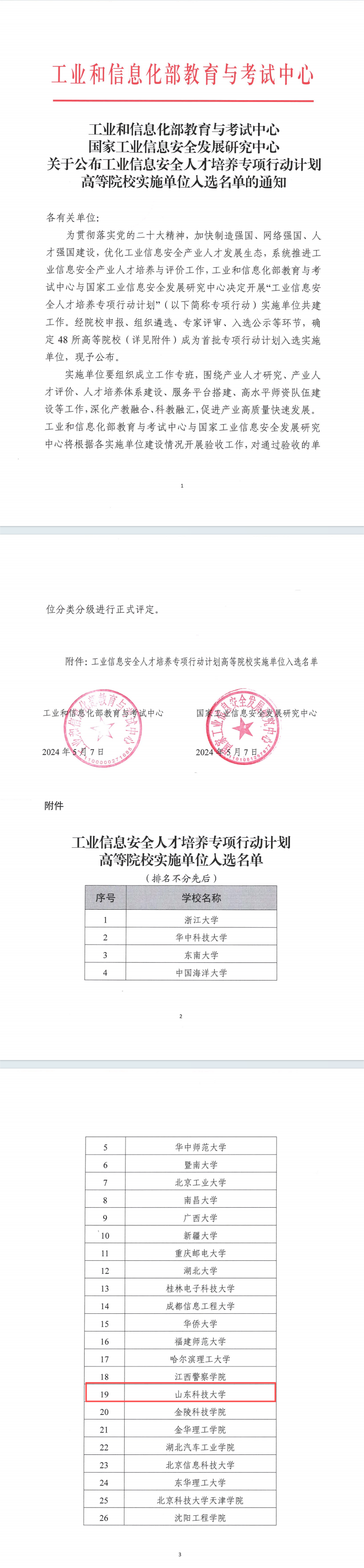 据悉,工业和信息化部教育与考试中心与国家工业信息安全发展研究中心,于2023年11月启动了“工业信息安全人才培养专项行动计划”。在公司、校区的支持和指导下,全球最大顶级体育平台依托国家级煤矿安全开采虚拟仿真实验教学中心、山东省智慧矿山信息技术重点实验室、山东省矿山物联网工程技术中心、山东省新一代人工智能技术协同创新中心、山东省工业数据感知与安全创新开放实验室等优质平台资源,第一时间组织成立工作专班,精心组织团队撰写申报材料,通过专家遴选、汇报答辩、入选公示等,公司最终成功入选首批专项行动计划实施单位。