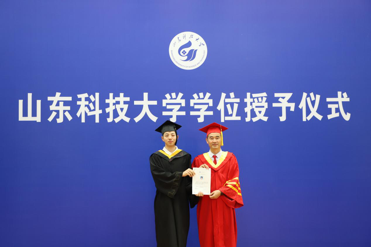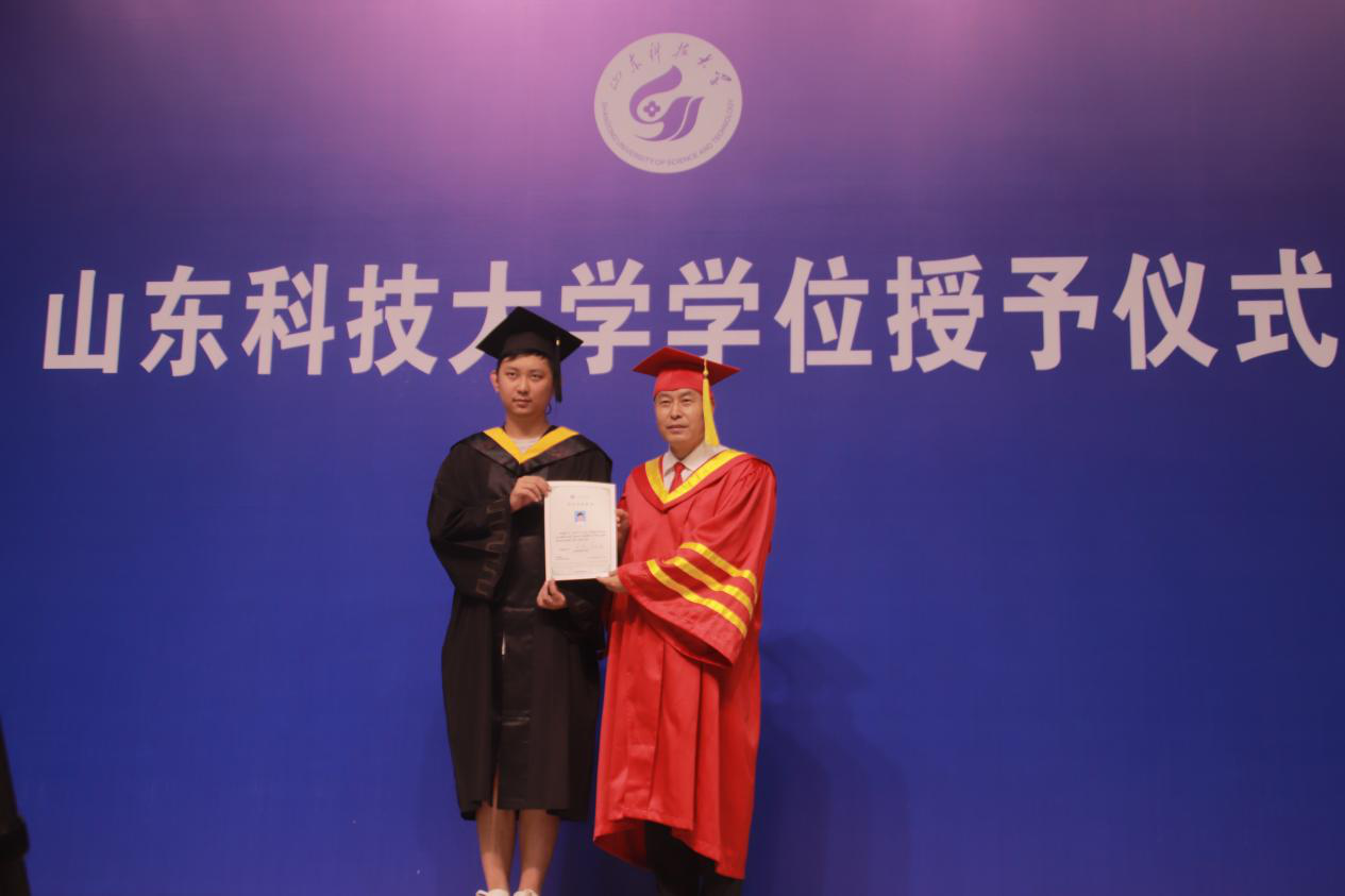 学位授予仪式上,毕业生依次上台,方亨福、戴东宝逐一为他们拨穗正冠,颁发学位证书,亲切握手,并合影留念。