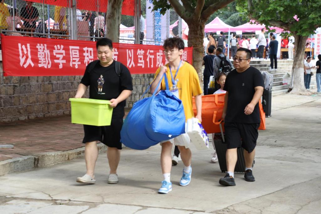 志愿者们穿梭于校园各处,主动帮助新生搬运行李,用汗水与笑容温暖每一位初来校园的同学。