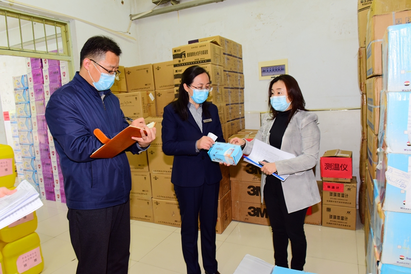 专家在查看疫情防控物资仓库(摄影:信永华)
