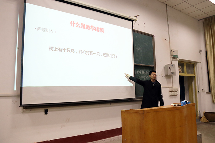 会上,孙玉先举了一个“以枪击鸟”的例子引入主题,由浅入深向大家讲解了什么是数学建模,随后,他针对数学建模的意义和乐趣、数学建模需要的能力、培养和提升建模能力的途径、公司以及企业认可的数学建模竞赛、数学模型分类、涉及软件及资料查找六大方面,向同学们分享了自己在众多比赛中积累的宝贵经验,并为同学们答疑解惑。最后,孙玉先以一篇竞赛论文为例,向同学们详细介绍了论文框架、内容组成、论文撰写技巧、比赛中的评审细节,带领同学们了解一篇论文从材料准备到最后完成需要做的所有工作。他说,数学建模对个人的发展和能力锻炼有着重要意义,同学们要敢于尝试、不断突破,在数学建模竞赛中切实提高自己的综合能力。