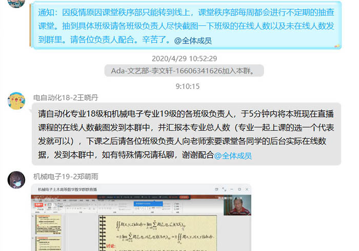 课堂秩序工作部要求各班学习委员、班长及时以截图的形式呈现在线、旷课同学人数等直播数据,汇总旷课同学名单后立即汇报至相关辅导员老师处理。后续,学风建设委员会将每周进行1至2次课堂随机抽查,以督促同学们端正网课上课态度,更加认真自律地对待线上学习。