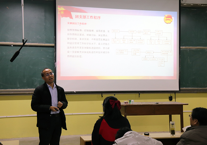 会上,谢清勇围绕团支部的工作目标、设置格局、工作职责、工作制度、教育管理、工作程序、工作台账七个方面对与会人员进行了培训,并对团支部书记提出以下要求:一、团支部建设要以“五个坚持”为原则——坚持党建带团建、坚持合力共为、坚持务实求效、坚持探索创新、坚持以服务促团建;在工作方面要以“四好”为目标——组织建设好、团员队伍好、活动开展好、同学反映好。二、合理设置团支部,紧紧围绕保持和增强政治性、先进性、群众性这一基本要求设置团支部,建设更加充满活力、更加坚强有力的高校共青团。三、明确团支部的职责,团支部是共青团的最基层组织,是共青团工作的立足点,各团支书要明确工作目的、落实工作职责,按照《中国共产主义青年团章程》规定认真完成对团员的教育管理。四、完善制度建设,助推团建规范化,做好基础资料的管理工作,完善团员花名册、工作计划和总结、会议记录、团费收缴台帐等内业资料。五、加强团员教育管理,注重理论学习,筑牢理想信念,将团员意识培养和形势任务教育抓实抓细,做好日常管理教育与团员教育评议。六、熟悉团支部工作程序,严格落实“三会两制一课”制度,加强团员队伍思想建设,努力建设能够充分体现先进性和发挥模范作用的团员队伍。七、做好团支部工作台账,严格执行“一册、一表、一盒”制度,保证支部资料使用的连续性和完整性,不断推进团支部工作制度化、规范化建设。
