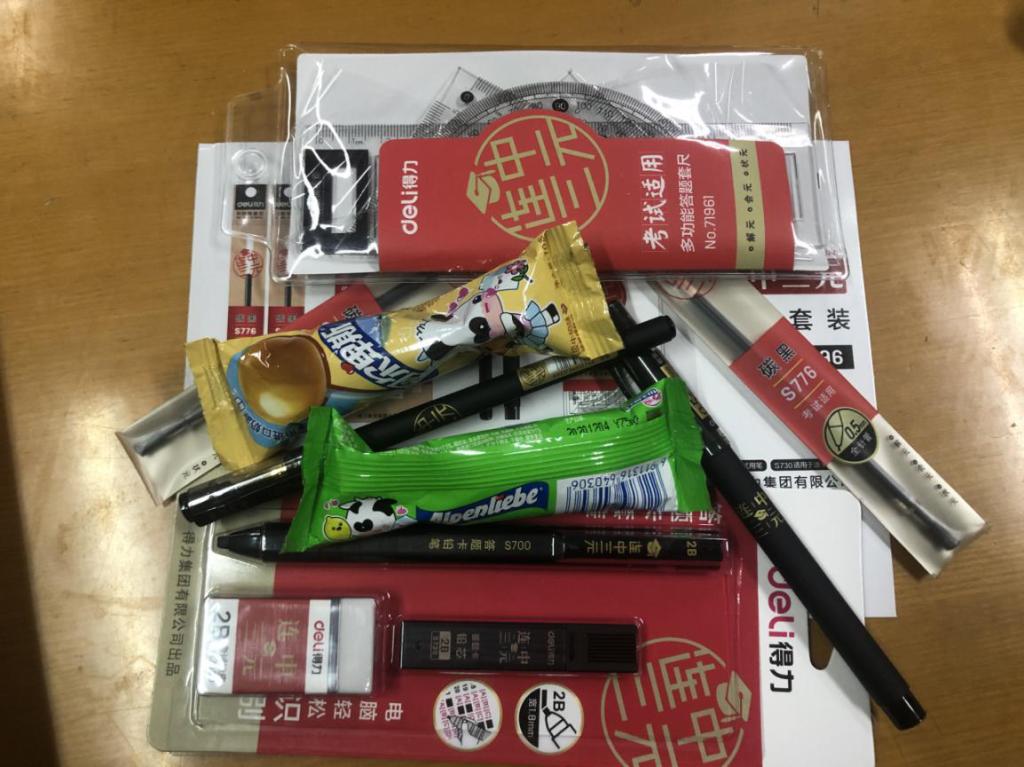 棒棒糖代表的是“棒”上有名,考试文具上写的是连中三元,一件件的礼物,充满公司师生对考研学子的期望