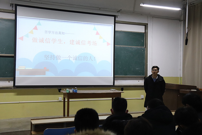 会上,高琳结合具体案例讲述了公司考试的相关规定以及对作弊行为的处罚情况,并提醒同学们在日常学习中要摆正心态,诚信应考,切忌侥幸心理。他强调,考试作弊被界定为最严重的违反校规校纪的行为之一,各班班委应负起责任,在考前督促同学们诚信应考,在考试中要做到遵守考规考纪,维护考场秩序。