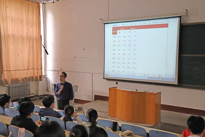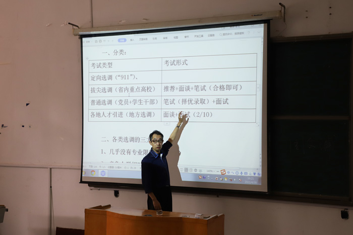 讲座中,周文浦向同学们介绍了选调生的具体分类,并讲解了每一类选调的考试类型和考试形式,并向同学们介绍了各类选调的发展前景。随后,他以山东省2020年度选拔录用选调生面试分数线为切入点,向同学们辩证地分析了选调的容易和不容易之处,使同学们对于选调有了更深层次的理解。最后,同学们纷纷向老师提出自己的疑惑,并得到了耐心解答。