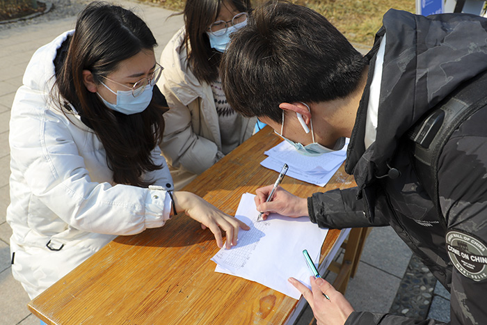 报道当天,辅导员带领志愿者坚守岗位、轮流值班,为返校学子提供贴心服务。“同学,请打开你的微信健康码、行程码,在前方测量体温后到报到处签到。”在校门的通道口,志愿者们身穿红志愿者服,热情迎接每一位同学,按照规定程序一一核验“健康码”、“行程码”及省外返校同学核酸检测报告,在测量体温后协助入校同学至报到处完成签到,确保每一位同学安全有序返校。从清晨到傍晚,志愿者们始终坚守在公司报到处,把握好入校第一关,为返校师生保驾护航。