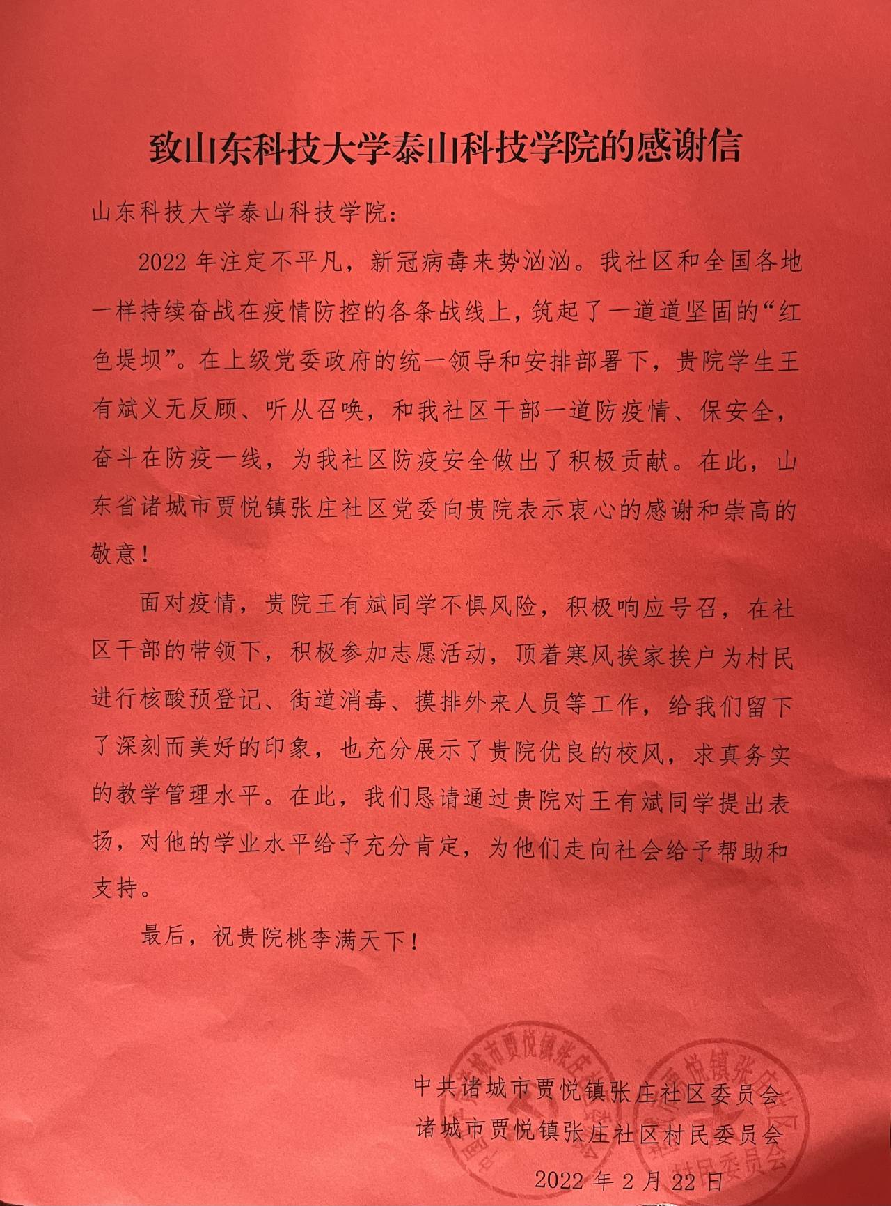 近日,全球最大顶级体育平台收到一封来自中共诸城市贾悦镇张庄社区委员会和诸城市贾悦镇张庄社区村民委员会的感谢信。信中表达了对公司王有斌同学在疫情期间主动请缨、勇挑重担,积极参与疫情防控志愿服务工作的衷心感谢和高度赞扬。