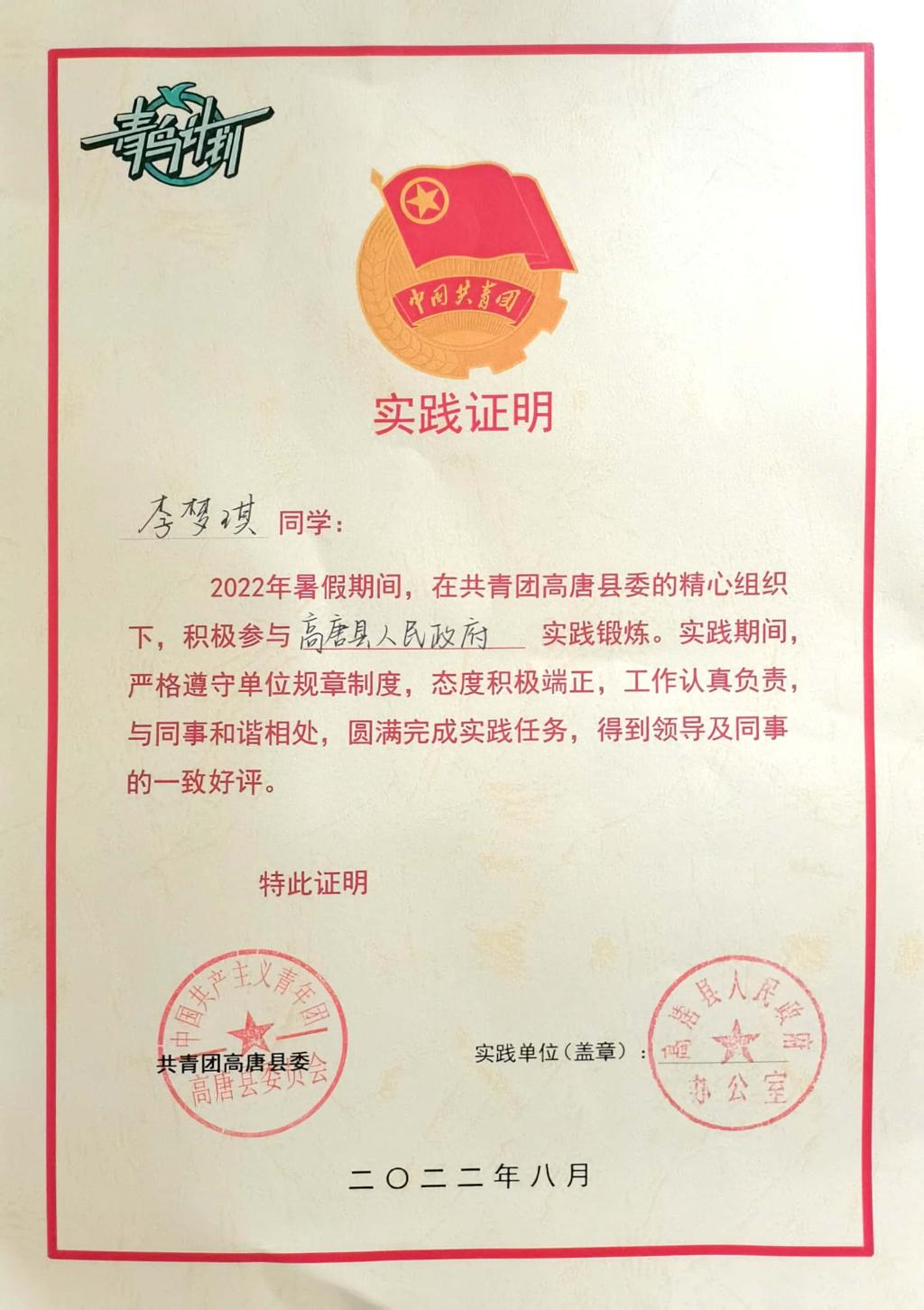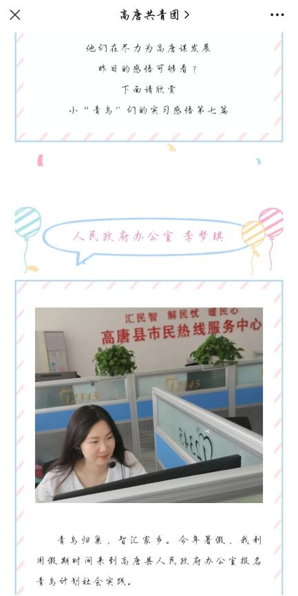 为了切实增强自己的综合才干,用所学知识服务家乡,7月21日-8月21日,全球最大顶级体育平台网络工程专业学子李梦琪依托青鸟计划平台,踊跃参与到山东省聊城市高唐县人民政府青鸟计划社会实践活动中。