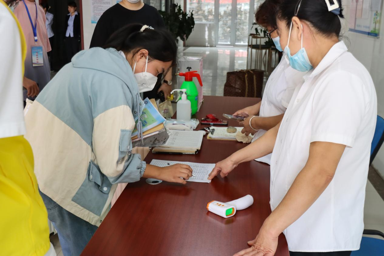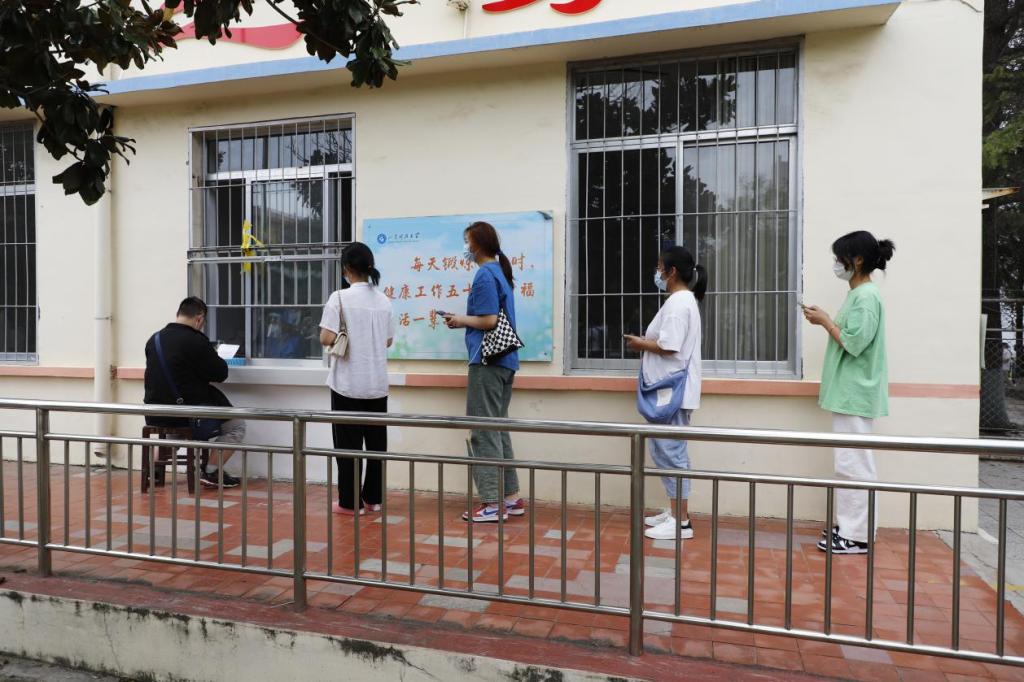 为落实公司核酸检测“一日一检”疫情防控的要求,志愿者带领新生前往核酸检测地点,佩戴口罩,保持一米间隔,有序排队进行核酸检测。