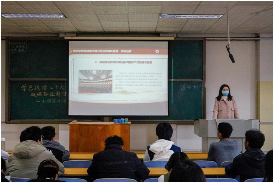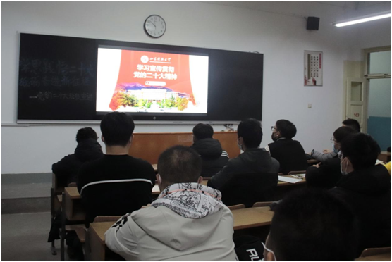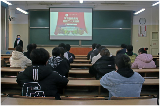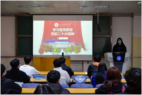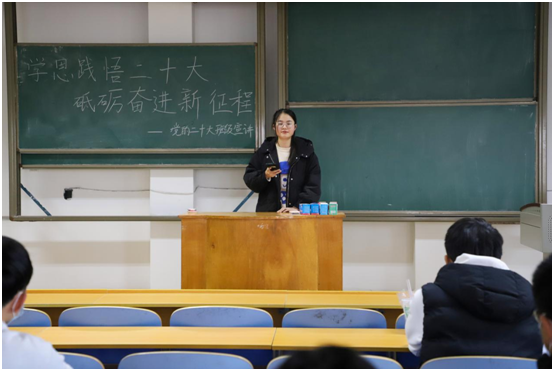 学习二十大,宣讲入班级。宣讲团成员走进班级,围绕党的二十大的主题、主要成果以及坚持党的全面领导和全面从严治党等方面,以原文诵读、学习分享的形式与同学们互动交流,号召班级同学们深刻领会“两个确立”的决定性意义,主动担当作为,团结一心,汲取中华文化和中国精神的时代精华,同时强化思想认知,把握好习近平新时代中国特色社会主义思想的世界观和方法论,开拓自身眼界,坚持初心使命,勇挑重任、求真创新,谦虚谨慎、自信自强,切切实实将党的二十大精神入脑入心,为全面推进中华民族伟大复兴贡献自己的青春力量!