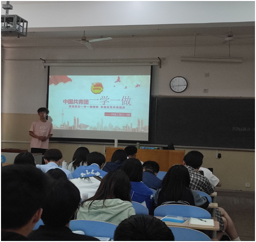 团支书围绕“贯彻落实一学一做精神,争做优秀共青团员”这一主题,向同学们阐明争做共青团员的重要性和必要性。团支书倡议全体团员深入学习贯彻以习近平同志为核心的党中央对共青团的要求和习近平总书记的青年工作思想,坚定理想信念,珍惜大好年华,牢记党和人民的厚望,矢志奋斗,不懈进取,在青年中发挥模范带头作用,努力争做一名合格共青团员,在建设有中国特色社会主义事业的伟大征程中谱写出更加壮美的青春之歌!
