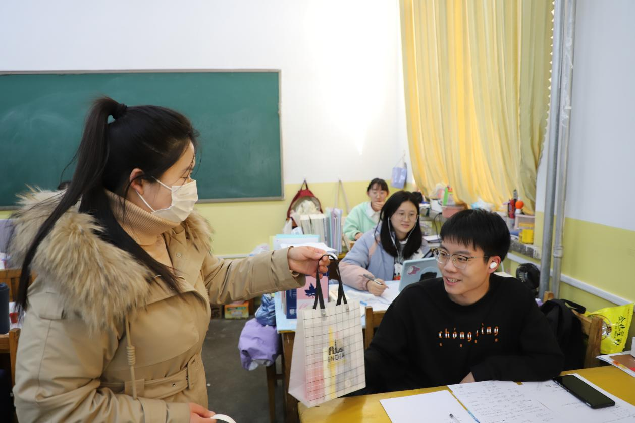 天刚明,时间尚早。为了不错过每一位考研学子,员工会工作人员早早到来,将每一份礼品耐心装好,在地上摆出祝福语的形状。辅导员老师把每一份礼物亲自送到每一位考研学子手中,力求不差一人,把公司的关怀带给所有考研学子。辅导员何颖老师说:“我知道,考研很苦、很难。如果我们送出的每一份礼物能给正在奋斗的他们带去一点温暖,那就要尽力把温暖送给每位学子。”