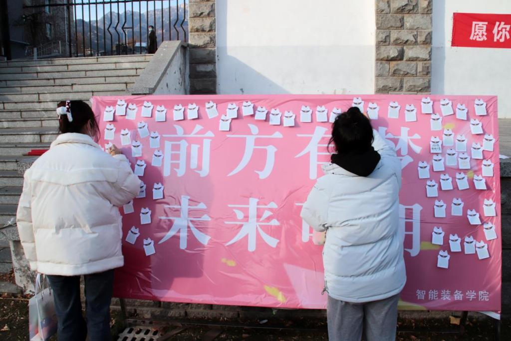 “且过腊月严冬,雪尽再看春花”“明年此日青云去,却笑人间举子忙”......学子们纷纷在写有“前方有梦,未来可期”和“我们终将上岸”的展板上写下自己的梦想和祝福。学子们将热血和壮志凝于笔尖,篆刻在纸上。公司通过这样的方式,点燃了学子们眼中少年独有的光和火,唤起了学子们一往无前的底气和信心。
