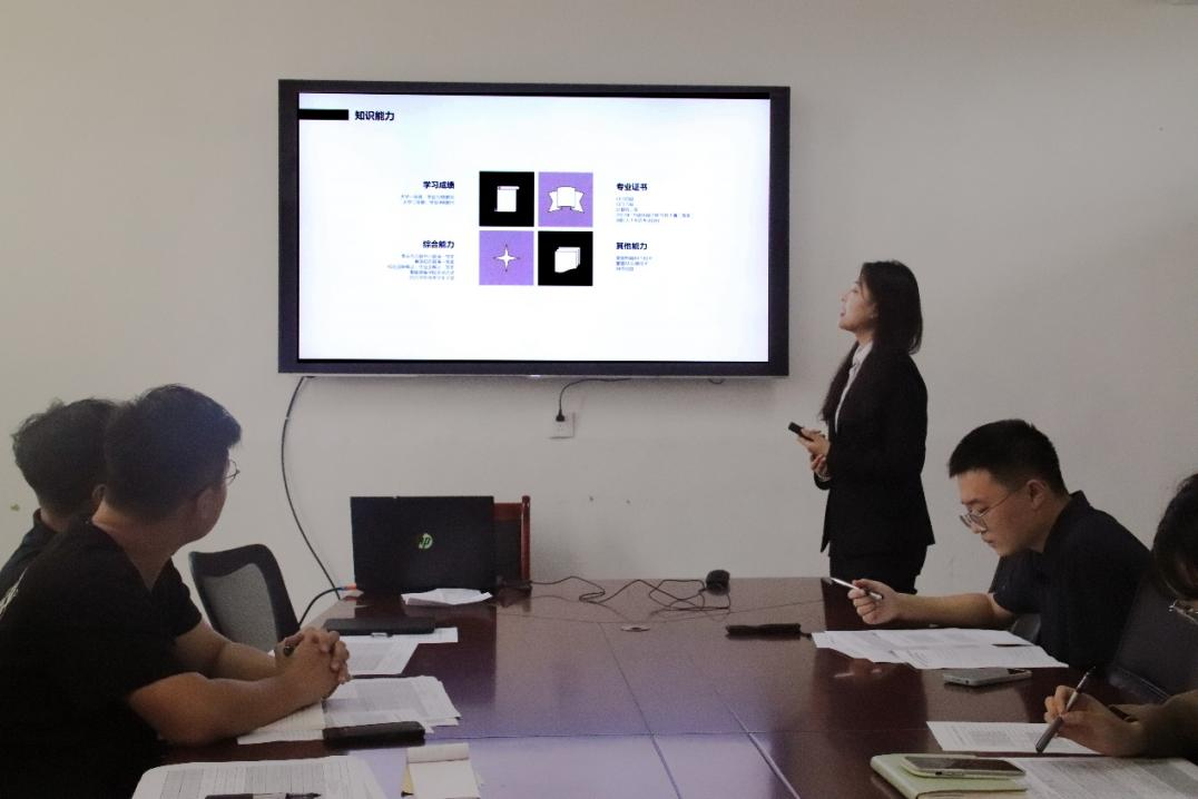 会议伊始,孙斌向评委和候选人介绍了本次评选的答辩规则。22名答辩人经个人申请、班级推选并由公司审核最终确定,他们采用ppt展示与演讲相结合的方式,分别从思想、学习、科技创新、社会实践等多个方面进行汇报。汇报过程中,候选人言辞流畅,表达清晰,从多个方面讲述了自己的学习收获和未来的目标。