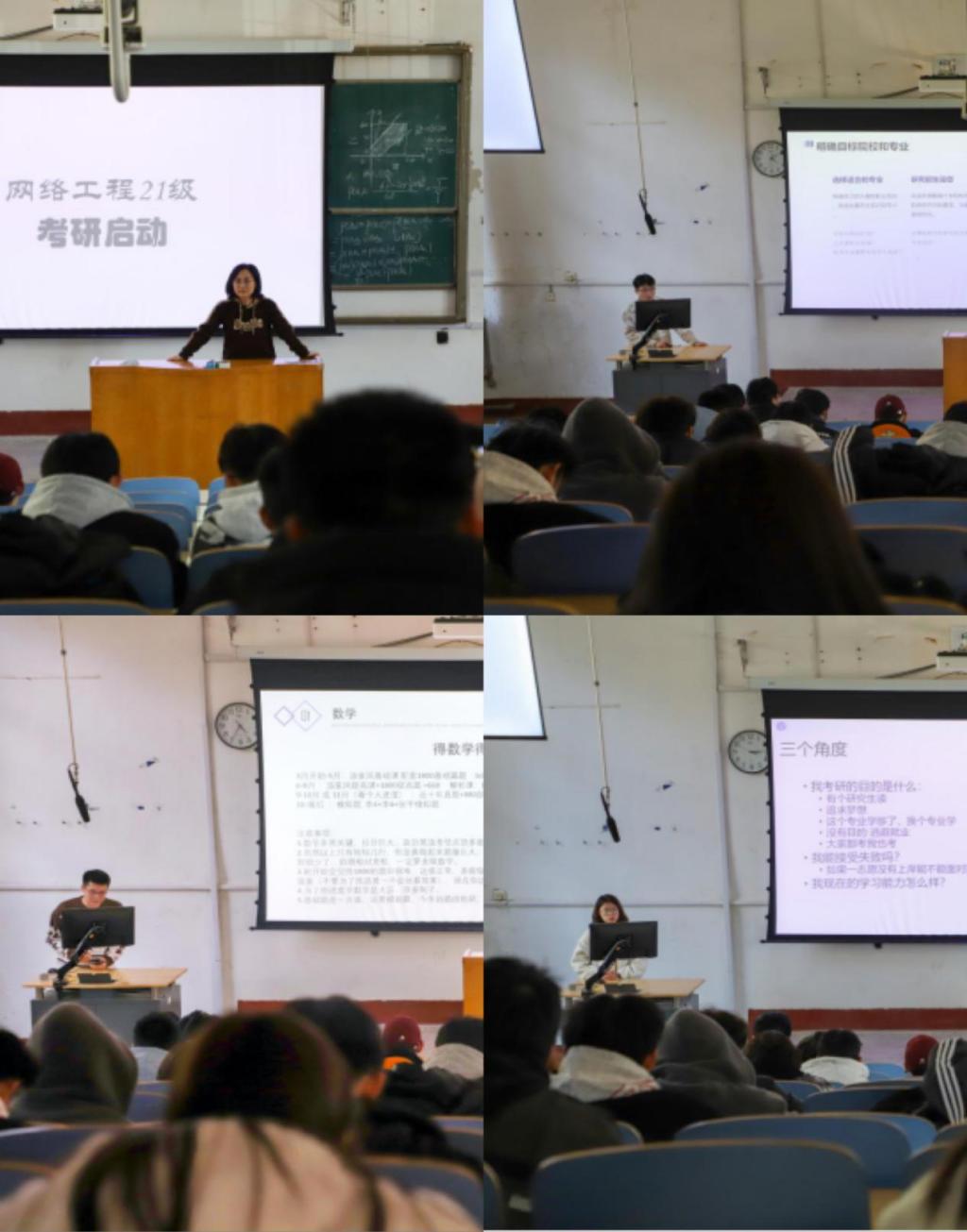 网络工程专场中,以刘颖超,卜文琦,时雨为代表的考研优秀员工从自身实际情况出发,讲述了自己在考前择校、专业选择、各课程的复习、考研资料、备考工具等宝贵的经验。面对学习过程中的枯燥和考试带来的压力,他们希望同学们要学会及时调整心态,始终坚守自己的目标和梦想。得益于同学们积极提问的热情,活动现场的气氛逐渐升温,学长学姐们也慷慨地为在场的同学们提供了解答和指导。