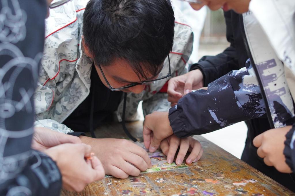 同学们围坐一起,计时器按下,比赛开始,大家各自发挥想象,精心挑选色彩斑斓的拼图,比对图案、拼接图块,拼图大体成形后在剩下的拼图块中寻找合适的,将它们拼入空缺处,让整个拼图更加完整。经过同学们的努力,一幅幅精美绝伦的拼图作品相继完成。