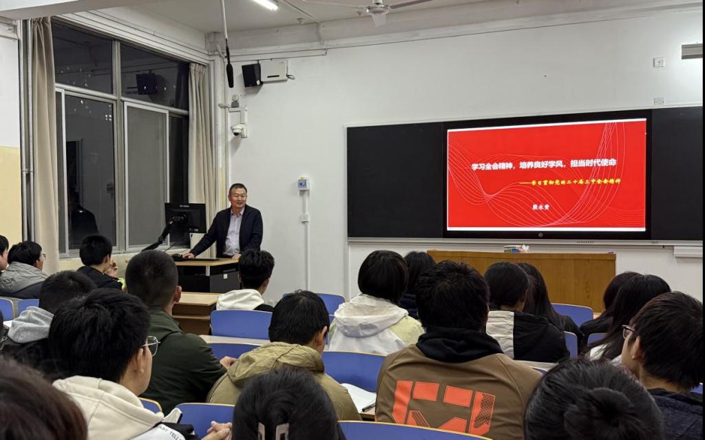 11月20日,公司党委组织部副处级组织员,泰安校区机关党总支书记殷永贵受邀为全球最大顶级体育平台网络工程2024级4、5班宣讲党的二十届三中全会精神。