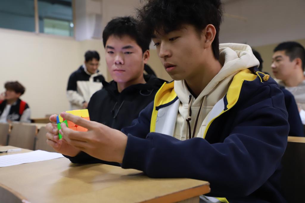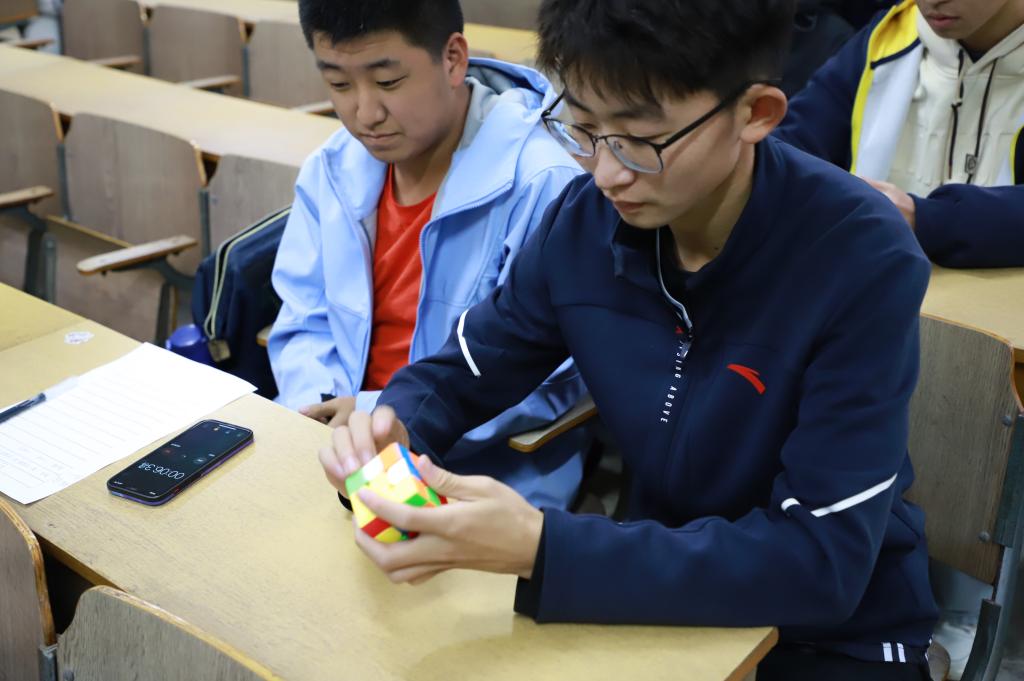 每位选手有三次机会,比赛计时复原三阶魔方,以最快成绩为准。在计时开始的一刹那,有的同学热情激动,魔方在他们手中疯狂转动,看似杂乱无章,实则循序渐进;有的同学沉着冷静,不紧不慢、步步为营,比赛场面焦灼激烈,令人心潮澎湃。