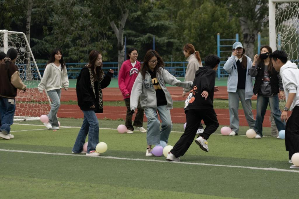此次趣味运动会共包含“你划我猜”、“小型保龄球”、“三人四足”、“背夹球”、“抱团取暖”、“气球大战”六个比赛项目。现场气氛热烈,同学们全情投入。其中“三人四足”格外考验默契,队员们互相扶持、齐声喊号,尽管步伐受限仍协力向前,引得场边阵阵加油助威。“你划我猜”中比划者手脚并用、表情丰富,猜题者紧盯细节、心领神会,默契配合不时引发欢笑。压轴的“气球大战”更是将气氛推向高潮,快速躲闪与清脆爆破声交织,现场化作一片欢乐的海洋。